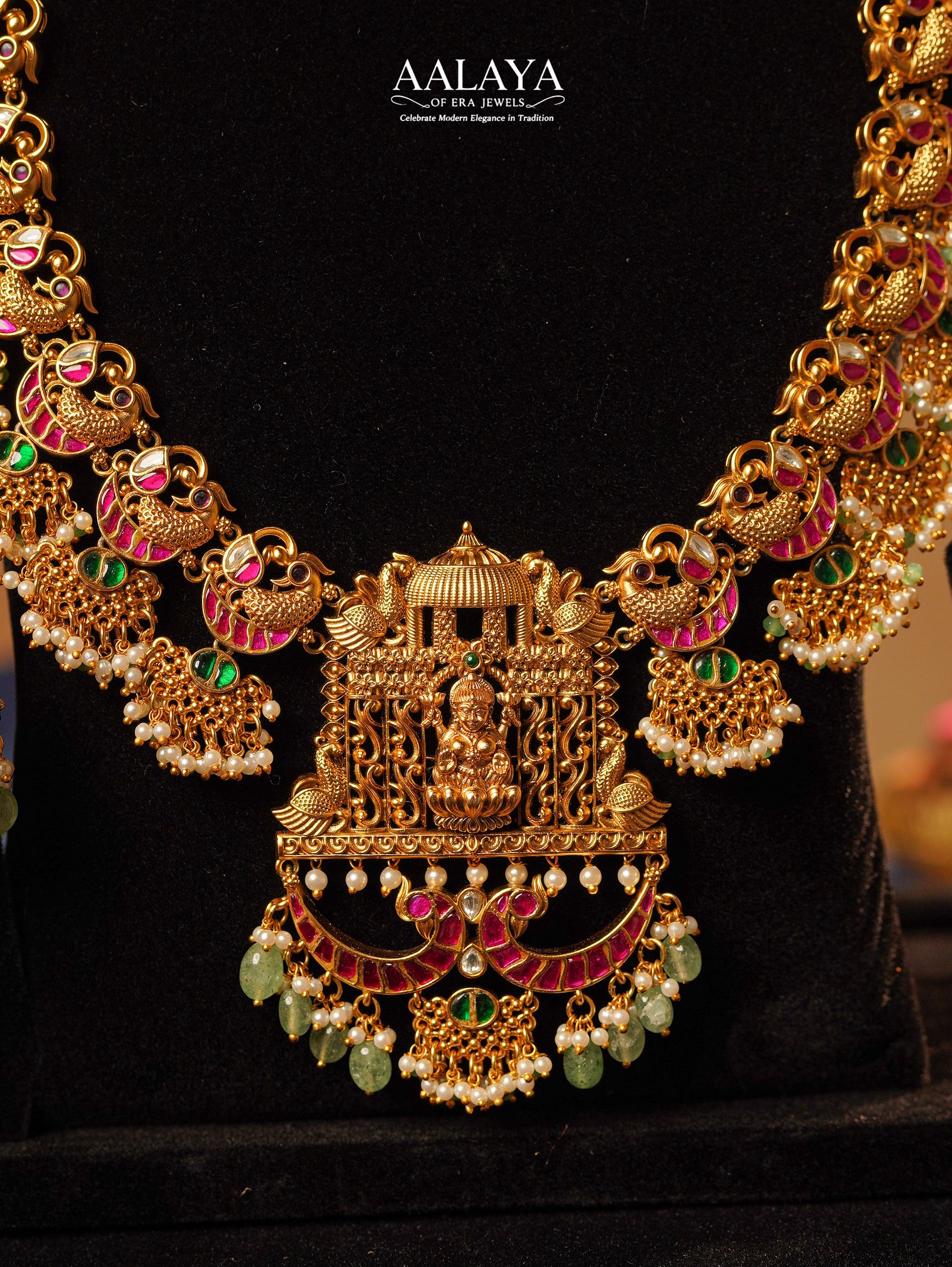 A magnificent expression of South Indian temple artistry, this grand jadauv haaram bridal set showcases intricately sculpted peacock motifs flowing into an ornate temple-inspired pendant. Accented with traditional stone detailing and finished with delicate pearl and green bead drops, this piece radiates devotional elegance and bridal grandeur.