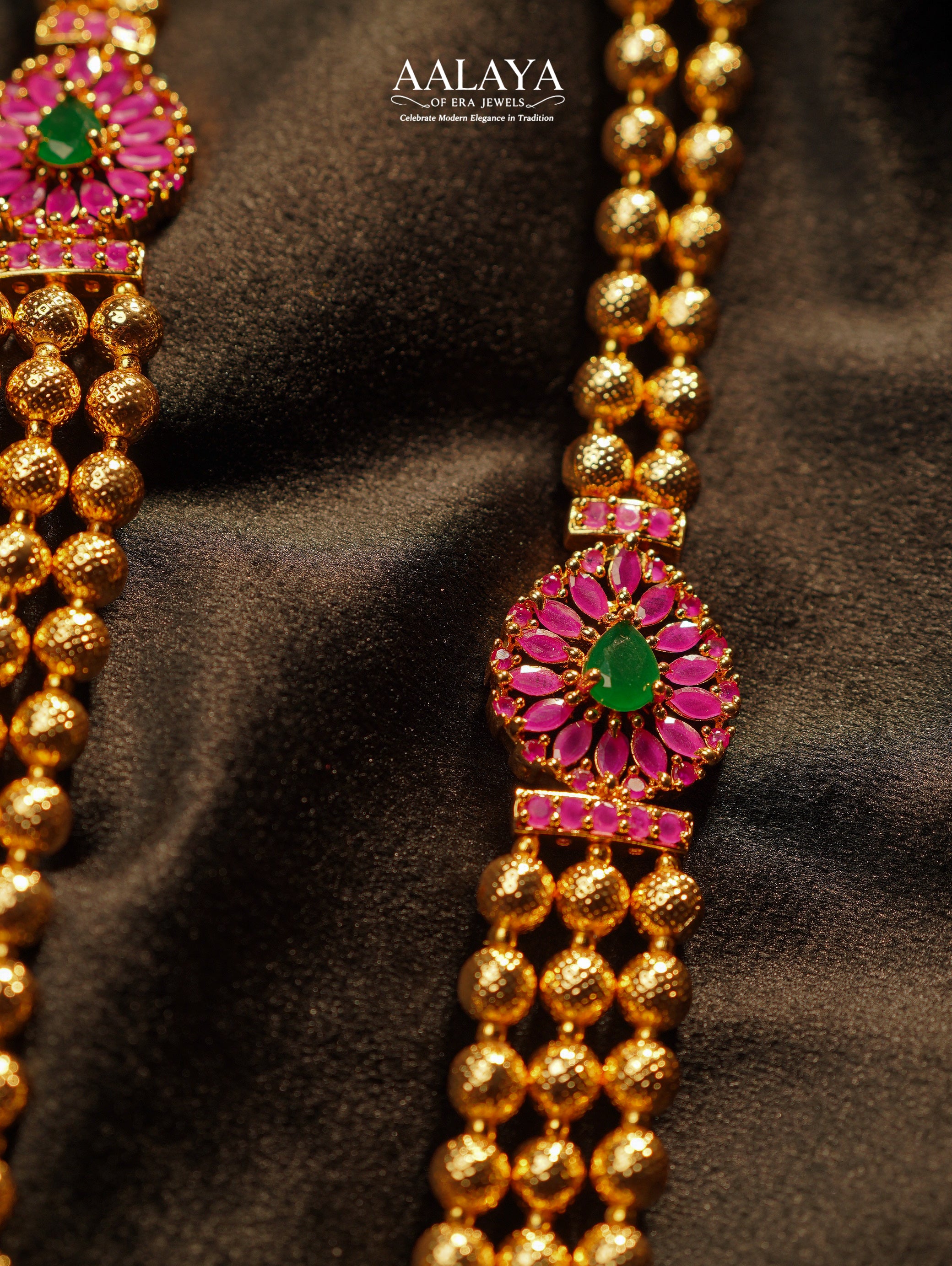 Rich in texture and traditional elegance, this antique gold-toned haaram features layered strands of finely crafted bead chains that create a graceful, flowing silhouette. The design is elevated by floral-inspired centre motifs, accented with deep ruby-toned stones and a striking emerald-green centerpiece, lending depth and contrast to the warm gold finish. Balanced and timeless in appeal, this piece is ideal for classic festive and bridal styling, offering heritage character with a refined, premium presence.