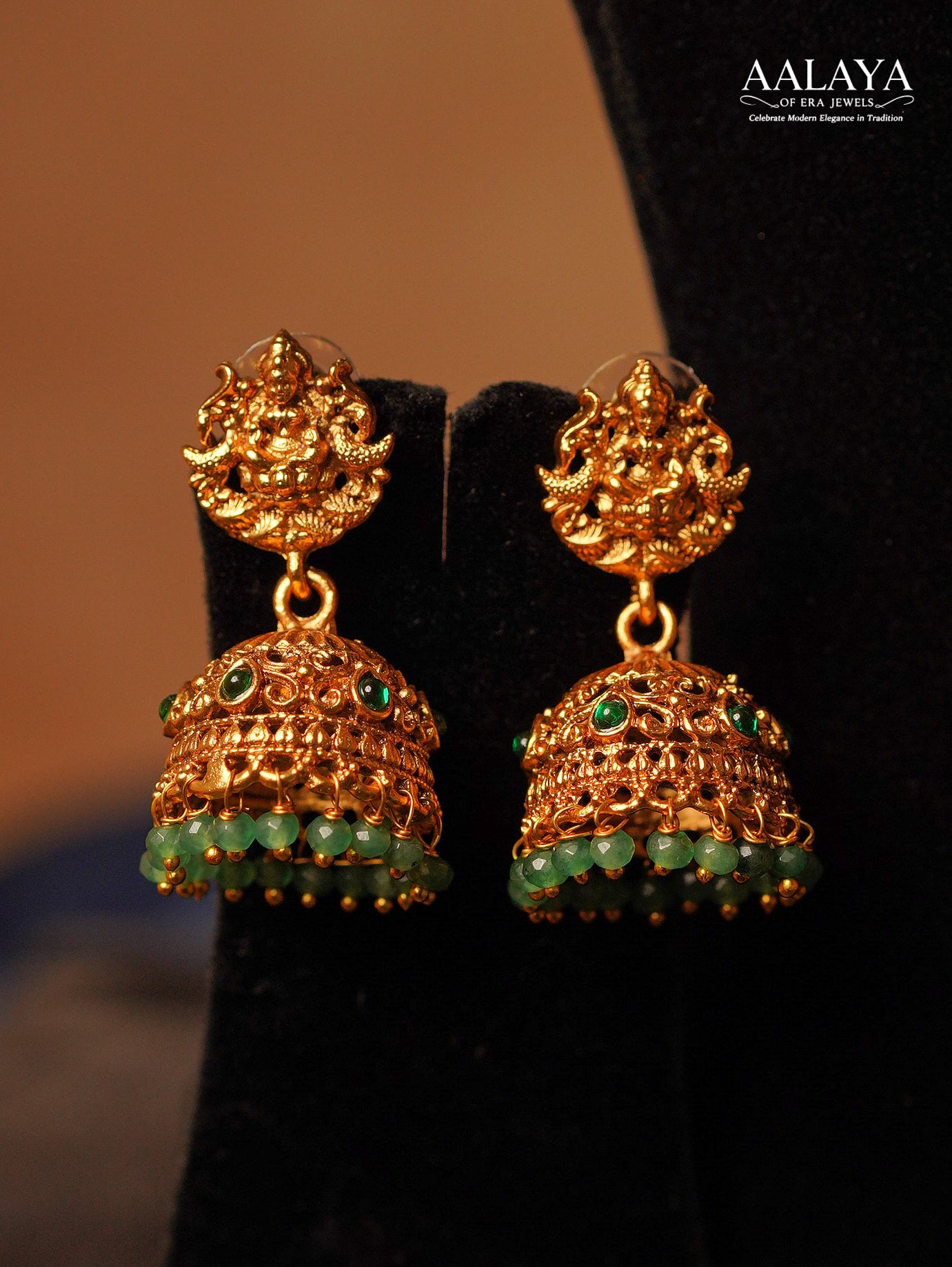An opulent celebration of divine beauty and traditional grandeur, this Jadauv-designed haaram set features a richly detailed chain of sculpted gold-toned beads paired with an intricately carved Lakshmi temple pendant. Accented with classic kundan-style detailing and finished with elegant green bead drops, the pendant radiates sacred symbolism and heritage artistry. Complemented by matching jhumka-style earrings, this set embodies timeless temple jewellery aesthetics with regal finesse, making it a statement piece for auspicious and ceremonial occasions
