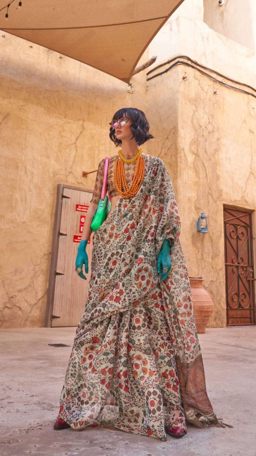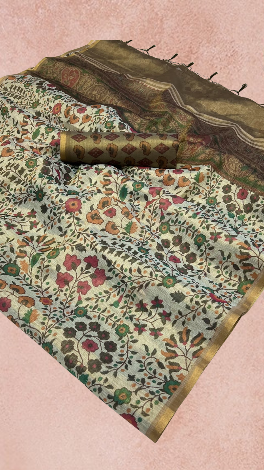 Off-White and Brown Floral Printed Handloom Zari Weaving Tissue Silk Saree