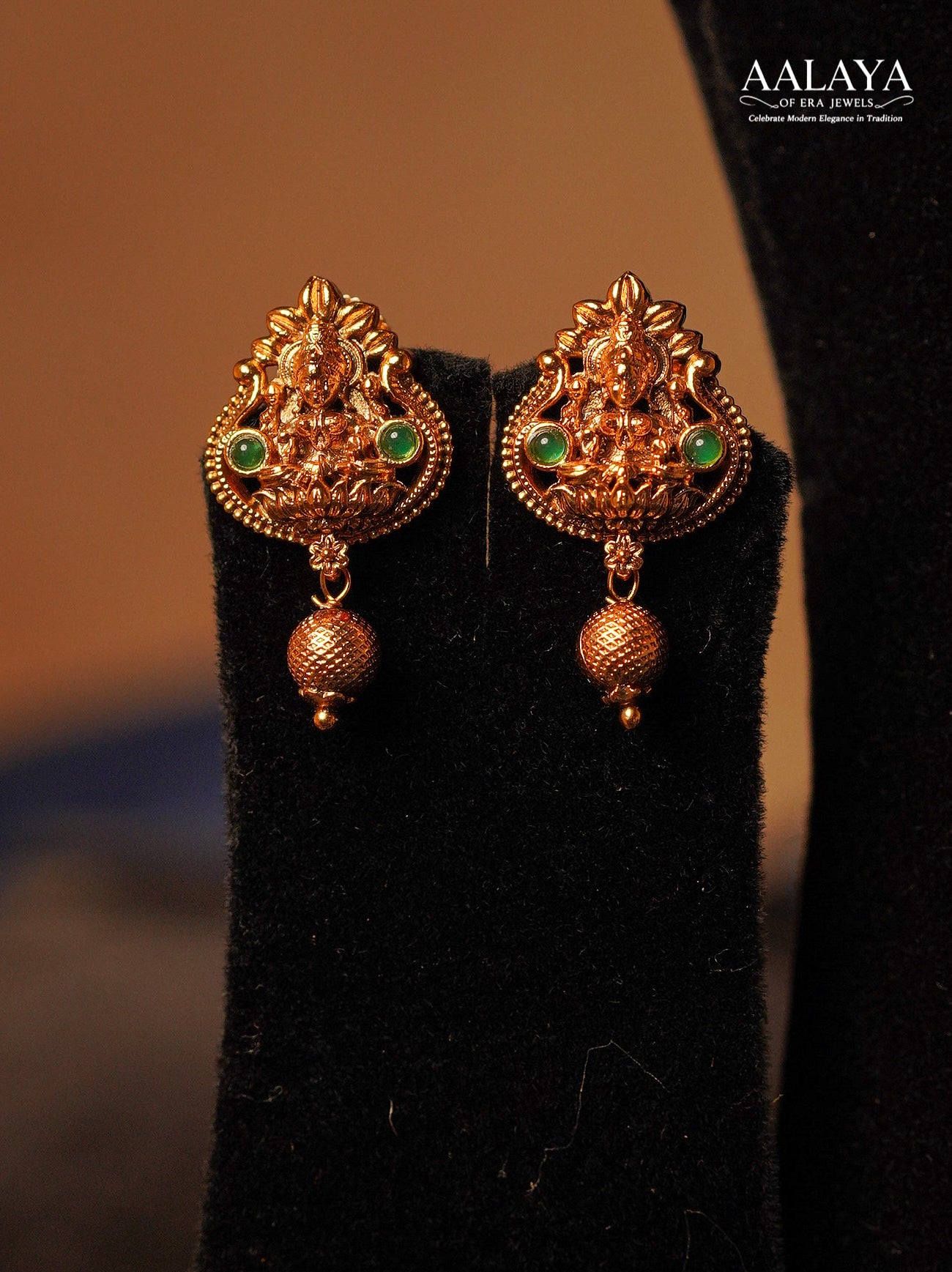 Designed with quiet elegance and traditional finesse, this multi-layer haaram set features finely textured antique gold-toned bead strands arranged in a graceful cascading form. The ornamental side motifs are delicately highlighted with green stone accents, adding a subtle temple-inspired character without overpowering the design. Finished with coordinated handcrafted earrings, this set offers a refined balance of heritage craftsmanship and contemporary wearability—ideal for those who prefer timeless luxury with restrained detailing