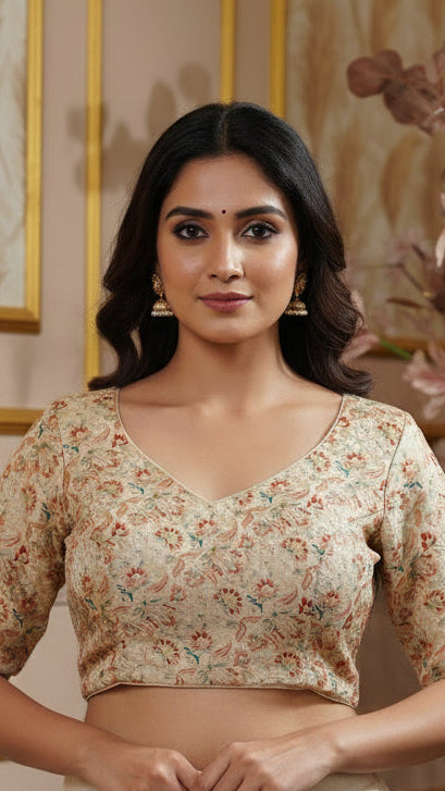 Light Gold Silver & Multicoloured Floral Patterned Designer Silk Blouse