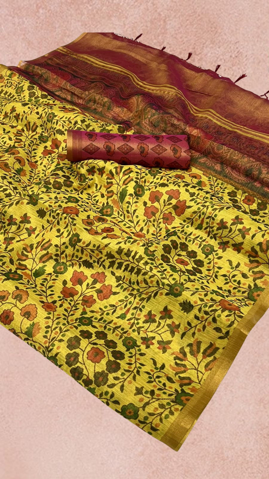 Mustard Yellow Floral Printed Handloom Zari Weaving Tissue Silk Saree
