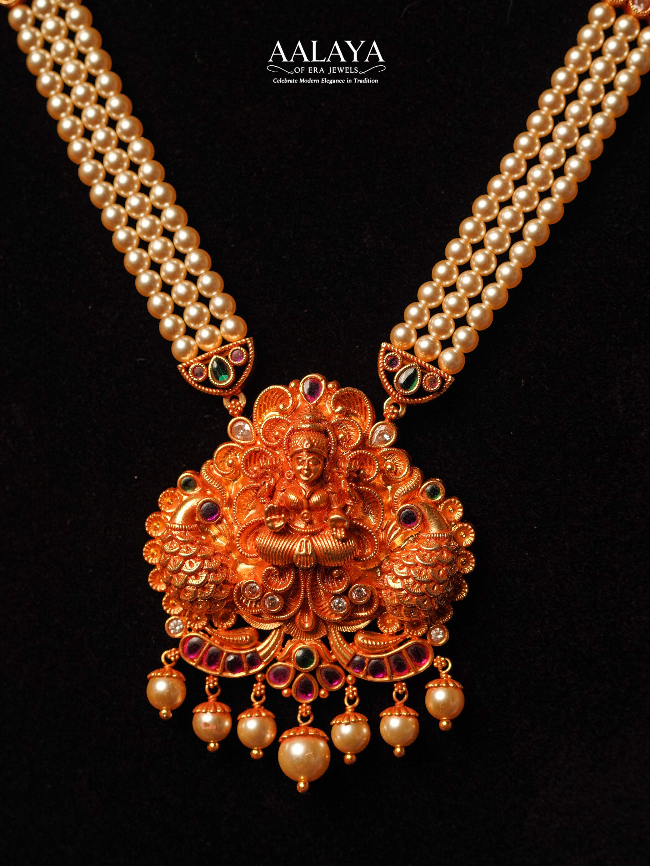 Gracefully blending classic elegance with traditional artistry, this pearl-layered haaram set features multiple strands of luminous pearls paired with a finely sculpted goddess pendant in a warm antique gold tone. Accented with subtle ruby and green stone detailing and finished with soft pearl drops, the pendant adds depth and movement while maintaining a composed, refined look. Complemented by matching jhumka-style earrings, this set reflects timeless temple-inspired craftsmanship suited for ceremonial and bridal occasions