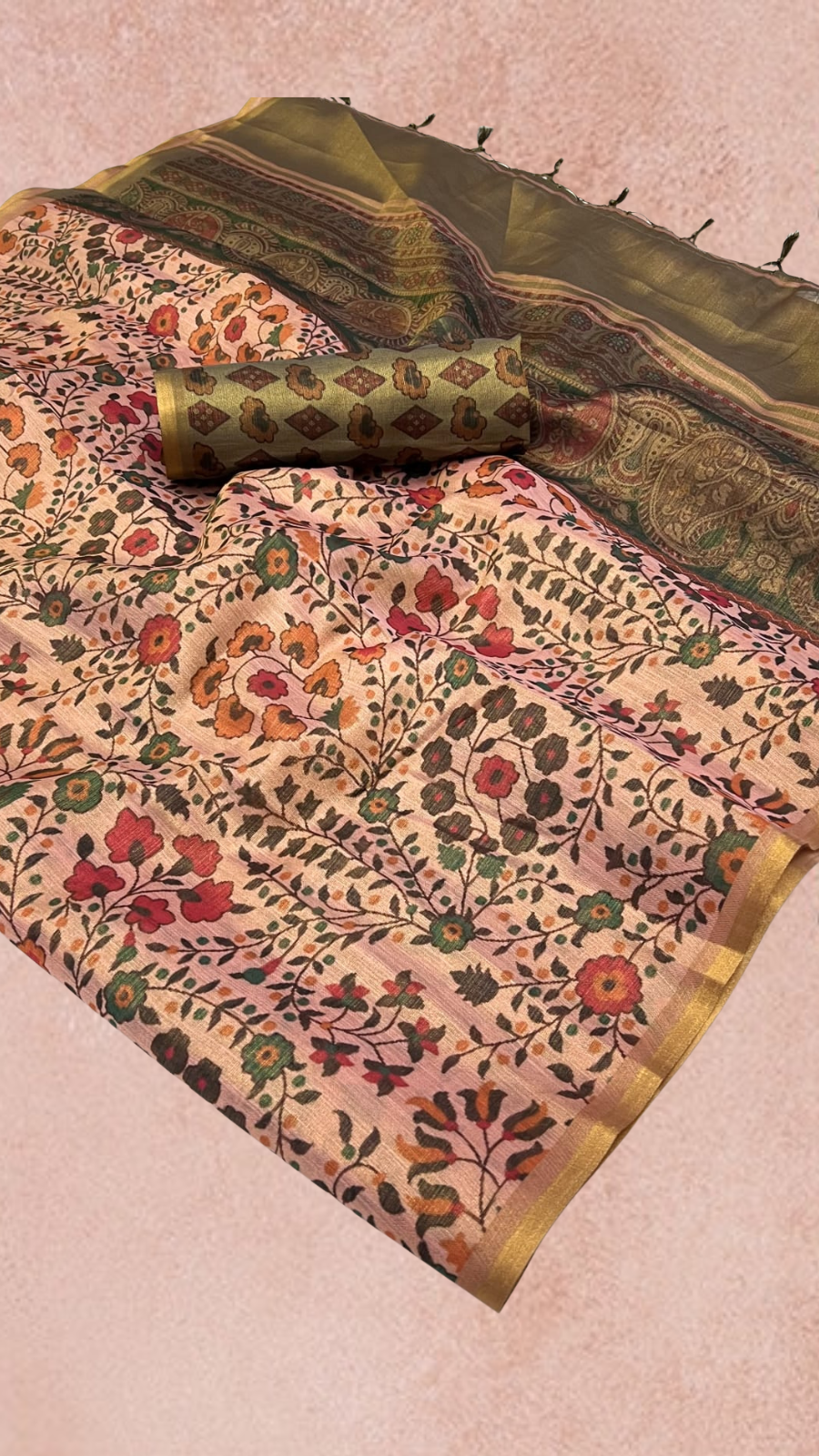 Pink Floral Printed Handloom Zari Weaving Tissue Silk Saree