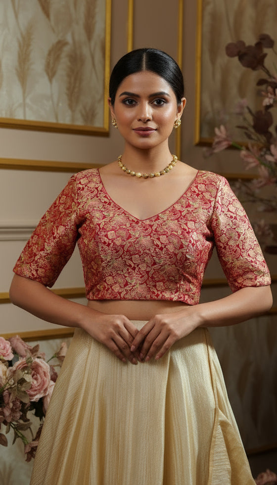 Red & Golden Green Floral Patterned Designer Silk Blouse