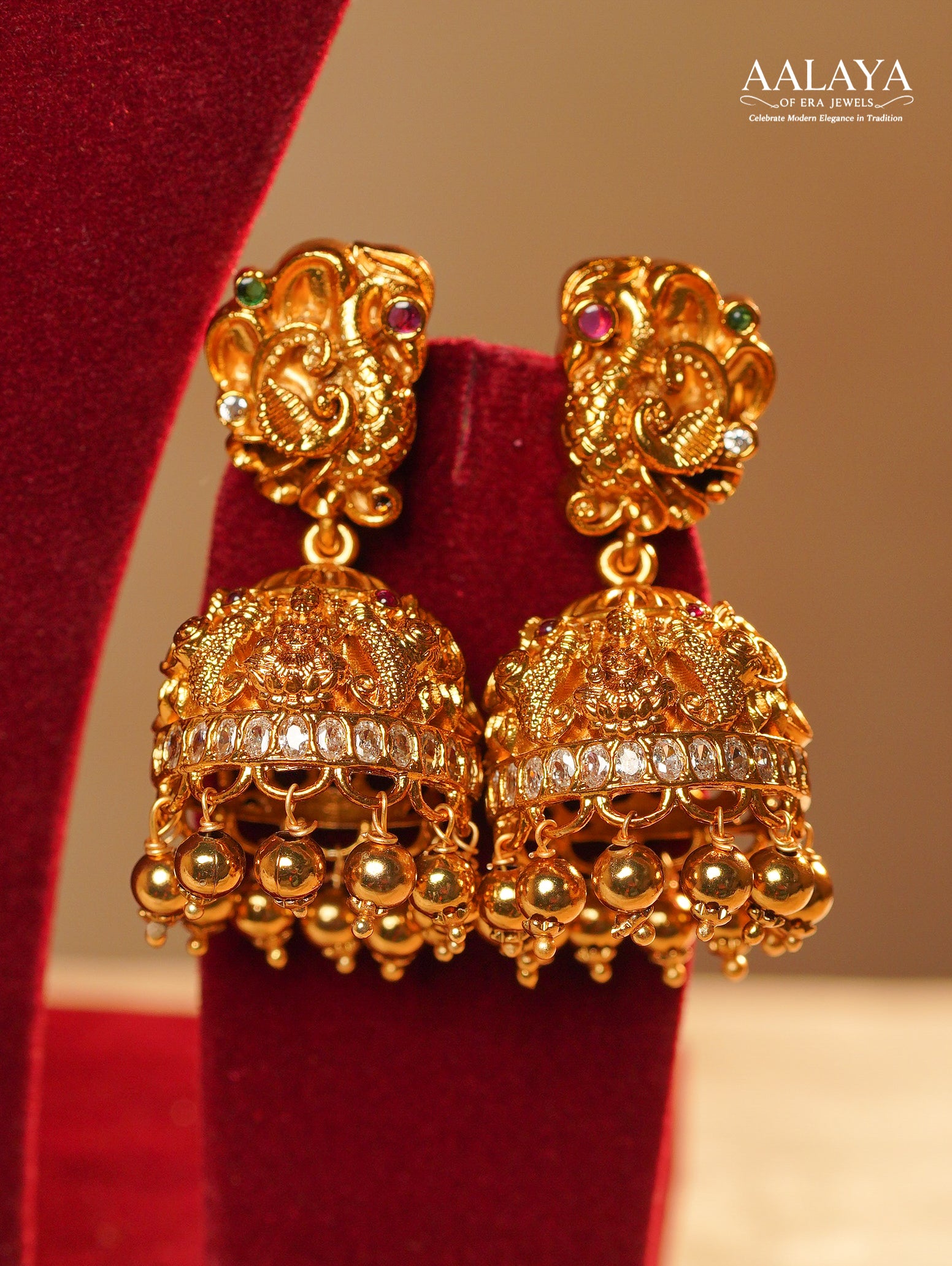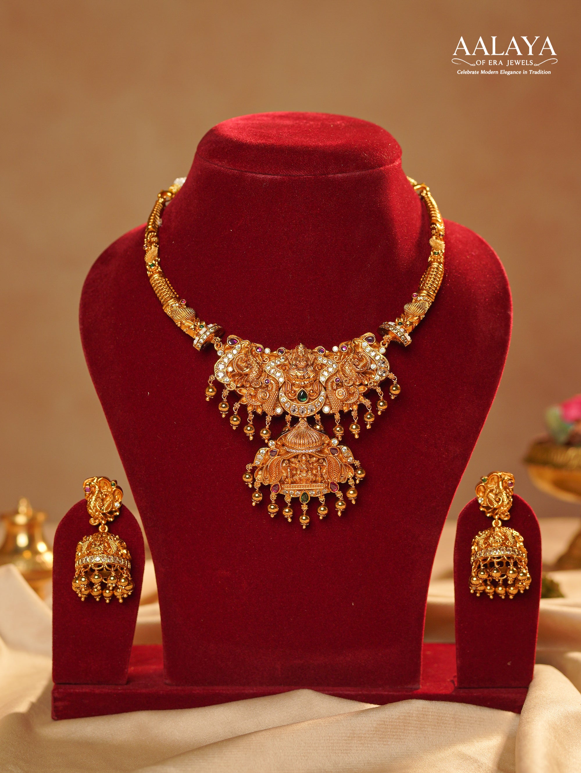 Rooted in classical South Indian temple artistry, this antique gold-toned necklace set features a richly sculpted goddess motif framed by ornate detailing and traditional symbolism. The necklace is highlighted with subtle ruby and green stone accents, complemented by delicate hanging bead elements that add depth and movement. Finished with matching jhumka-style earrings, this set reflects heritage craftsmanship with a strong ceremonial presence—ideal for bridal wear and auspicious occasions.